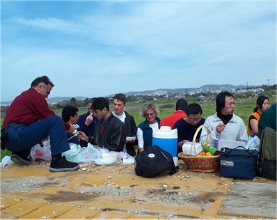 Picnic Table at Coral Bay. "Our Branch is very much like a singles' branch. There a few older singles and a few married people, but mostly young people and the missionaries. The branch members, investigators, and all but two of the young missionaries on the island went on an excursion to Pafos. We took our food which they carried in the luggage compartment of the bus until we found an idle flat bed trailer in a beautiful meadow along the beach which we used for a table." |