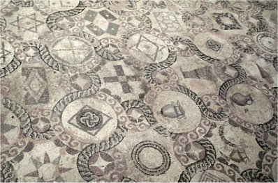 Mosaic Floor.at Pafos. "There is interesting history for all the Roman ruins, the catacombs, etc. My favorite thing to see was the mosaic floors in the remains of some ancient dwellings of the rich and famous. They still have bright colors and look like sculpted carpets." |