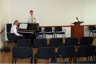 Church Sign in the Building Entrace. "We have parking spaces below in the basement where the missionaries are able to park their bikes and the few members with cars can park their vehicles. It is still quite new, and the nicest meetings space in the entire mission. But, we are growing out of it, and we have been assigned to find a bigger place." |