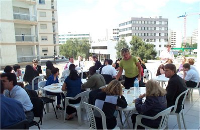 Pot Luck Lunch on the Patio Space. "Today we had our monthly pot-luck after the block of meetings. We smell casseroles and food cooking all during our meetings on this day. There is a deck/balcony that our hallway opens on to where we set up our eight tables. Today we had more people for dinner than we could seat out there. " |