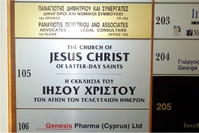 Office Building that the Nicosia Branch Meets in. "We live just two blocks from the Church which makes it very handy for us. The Church meets in an office building on the first floor. (Not the ground floor). When our mission President is here, he borrows our car to visit the other two branches on the island. We can still get back and forth to the Church just as fast as we can drive it." |