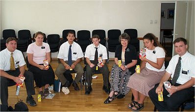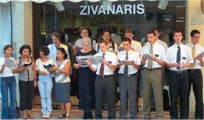 Street Singing in Old Town. "Sunday evening we went to Old Town here in Nicosia and did street singing for about an hour. Those who couldn't or wouldn't sing, would stand away from the group and talk to people who stopped as they went by. Many Books of Mormon were handed out in several languages that evening." |