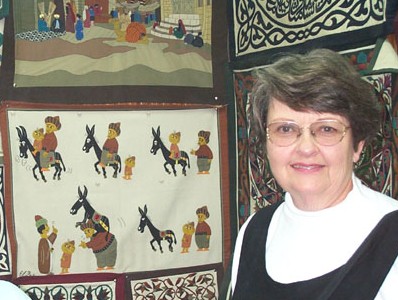 Applique Shop. "It's amazing how intricate the patterns are, but there is quite a difference in quality of work. The one you see behind us tells a story: A man and boy are riding on a donkey which is huffing and puffing. The boy gets off and the donkey does better. Then the man gets off and the boy gets on and the donkey does even better. Then the man carries the donkey. They meet a man who tells them how foolish that is and then they all walk." |