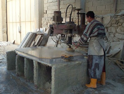 "Granite and marble are very plentiful here and are used in building everything. They even put it on the retaining walls along the roads where they build bridges and overpasses. It all looks quite light, but that's because it has not yet been polished. There in the yard, the dust is unbelievably thick. This picture with the man polishing the slab doesn't show the water very well. Water and polishing compound come out of the buffer as it spins." |