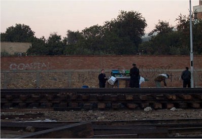 Breakfast Bar "We live close to the railroad tracks and hear the trains regularly. Early in the morning, there is a man who brings in a breakfast bar pulled by a donkey. He parks it right next to the tracks and has an amazingly large clientele. They sit on the tracks to eat. I was finally able to get Paul to take a picture of it. In fact there are two such places about 500 feet apart." |