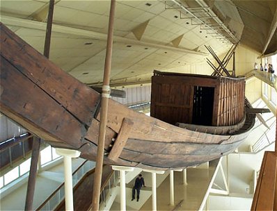 "This boat was buried in its own tomb and unassembled. The pharaoh was supposed to be able to assemble it after this life and sail to heaven in it. It is a fairly recent discovery and they had put all the pieces together adding a few parts to replace those that were probably far too decomposed to use. But much of it is the original wood. Reminded me of what they have done in Norway with old Viking ships they have restored and set up in museums." |