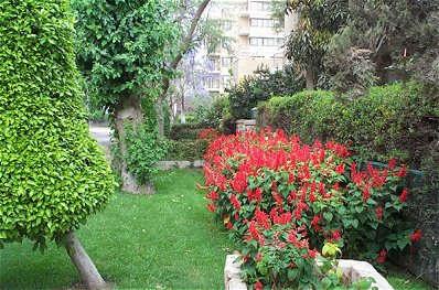 The British occupied Egypt for 80 years (up until 1952) and have planted in Maadi so many flowering trees and shrubs. It is delightful to walk down a street with flowering trees arching over the road-- until they begin to lose their blossoms which fall on your clothes and leave a stain. And the Holly Hocks seem to grow everywhere. Some get really tall, 10' or so, where they get more water. |
