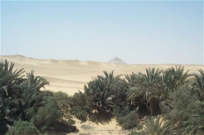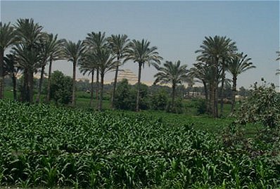 Red Pyramid on skyline. "One of the great views was seeing where the Nile Valley ends and the desert abruptly begins. We took pictures along the road of rural areas as well as the pyramids and ruins. It was different to see crops of wheat growing in groves of date palms. It has to be harvested by hand." |