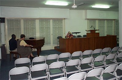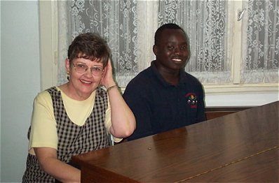 Sister Taylor teaching piano lessons to Bosko. "We have a lovely grand piano that was donated to the Branch. It is quite a different thing to play than the electronic keyboard that the Church has for people to take home and use for practicing." |
