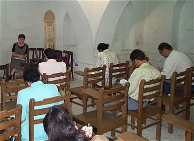 "The mini-cathedral rooms that are all cement and are absolutely the poorest place to teach English because of the echoing and the noise of two ceiling fans going on above at high speed. Sometimes when we arrive at 5:30 p.m. the rooms are like ovens, especially Paul's since his room doesn't get any shade at all." "We have really come to love these young people and hope our efforts will help them." |