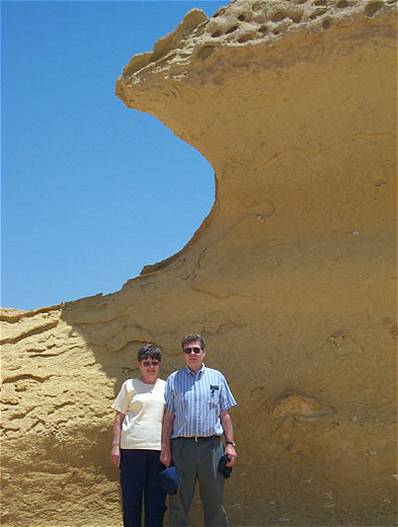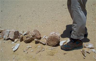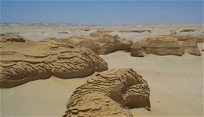 Fossilized Reefs in Wadi El Rayan "We had been told that these strangely shaped mounds were wind sculptures, and in a sense the wind has shaped them. But it is because they are fossilized coral reefs that they have withstood the winds of time. It was beautiful scenery, but until we got there Paul had no idea of what a treasure chest of fossils it was." |