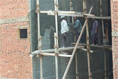 "The men on the scaffolding behind our apartment are applying a coat of cement over the rough brick structure. What back-breaking work! They haul cement up by hand on small pallets that a single man can carry and it is all applied by two men. We are talking about a 10-story apartment building. They are experts in cement and we never cease to be amazed at what beautiful work these craftsmen can do. |