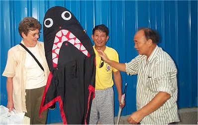 Nancy with Kite Flyers on Street. Paul is amazed at how they can fly kites in the city between power lines and tall buildings. |