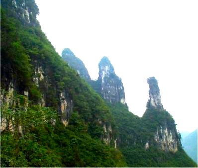 Near Dehang Village. Near the Dehang Village is a mountainous area where we saw some of the most spectacular scenery on the earth. The bus didn't stop enough to suit us and so we were frantically trying to take pictures through the windows. It was like what you expect to see in China with all the terracing and rice paddies with steep mountain cliffs soaring above and cloudy mists encircling them. Only the Miao people live there. |