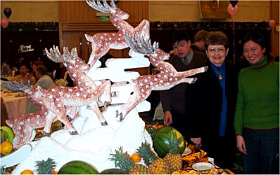 Foreign Teacher Christmas Party On December 23, the Provincial government sponsored a Christmas party for all the foreign teachers. The buffet was beautifully arranged with all kinds of food--all Chinese of course. The foreign affairs office arranged for two students to escort us. It was a major thrill for them to attend such an affair. |