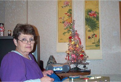 Nancy on Christmas Eve. Our little Christmas tree is made of tinsel and stands about 24 inches high. All the ornaments are oversized for such a little tree, and the lights all blink on and off together which is hard to watch. We do have some Christmas music to play, and the campus is decorated with lights--but not to celebrate Christmas, but their 60th anniversary. |