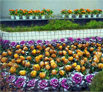 Mums and Kale in the Snow. The flowers that were put out for the December celebration of the university's 60th anniversary are gone, all except for the flowering kale. It seems to be even hardier than the pansies. Paul had to take pictures of them with their coats of snow and of course the lawn as well. It was the first snow that stayed on the ground this year.. |
