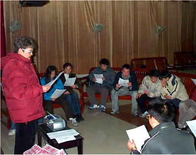 Nancy Teaching in Unheated Auditorium. Today was considerably warmer and no ice to be seen anywhere. They tell us that December is the coldest month here, and I hope they are right. It's the teaching in unheated classrooms that gets to us. Going out in the weather to walk is no problem. But one's hands nearly freeze in the two hours we spend in the classroom. We need to buy some gloves that have openings for finger tips. |