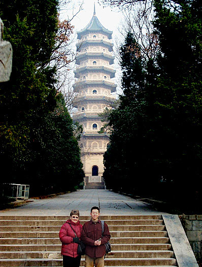 Ling Gu Pagoda (Soul Valley) The Ling Gu Pagoda is really neat. It is 60 meters high (9 stories), has great granite facing, pretty green tiled roofs, and a spiral staircase in the middle to climb to the top. Paul only went up three levels because of the haze. You really couldn't see very far, maybe a half kilometer at best. |