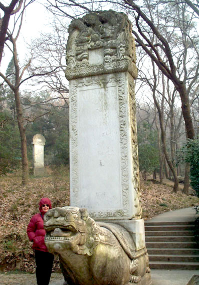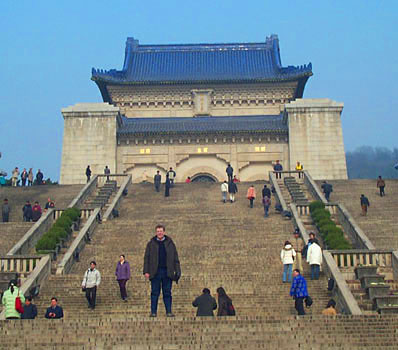 Sun Yat-Sen Mausoleum. From the entrance to the memorial hall there are 392 steps in four flights of stairs. This is a must for anyone who comes to Nanjing to visit. There were a lot of Chinese tourists here, even at this time of the year. I got to the first step and decided it was a good time to visit the tourist shops that we had passed. Paul climbed to the top, took the obligatory pictures, came back down, and came and found me. |
