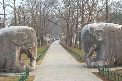 Sacred Avenue of Zhu Yaun Zhang The sacred avenue at the burial grounds of Zhu Yaun Zhang, sometimes called the "stone elephant road," is lined with stone animals. Sometimes the animals are kneeling and sometimes they are standing. I am not sure of the significance of this, but it must mean something. Click here to see more animals. |