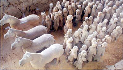 Terra Cotta Warriors Also in Xuzhou there are some recently excavated tombs of the ancient rulers. They discovered miniature terra cotta warriors in one of these--about 18" tall. (In Xi'an there are some famous ones that are life-sized--discovered in 1974.) |