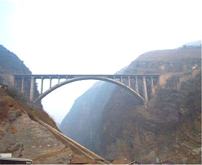 Daning River Bridge at Wu Shan. The full expanse of the dam will be finished by June, 2003, when the water will begin to rise. The river level is now about 50 meters above sealevel. It will rise to 175 meters when the dam is completed. The lake water will be 7 meters below the top of the bridge span. The views of the 3 gorges area will be changed forever with much of it being under water. Some cities have to be completely torn down to prevent navigational problems. |