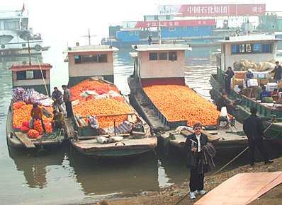 Orange Barges Near Yichang. There were barges everywhere loaded with oranges. The gorge area is noted for it's oranges and the farmers carry the fruit down the steep sides of the gorge to the river where the barges pick them up. |